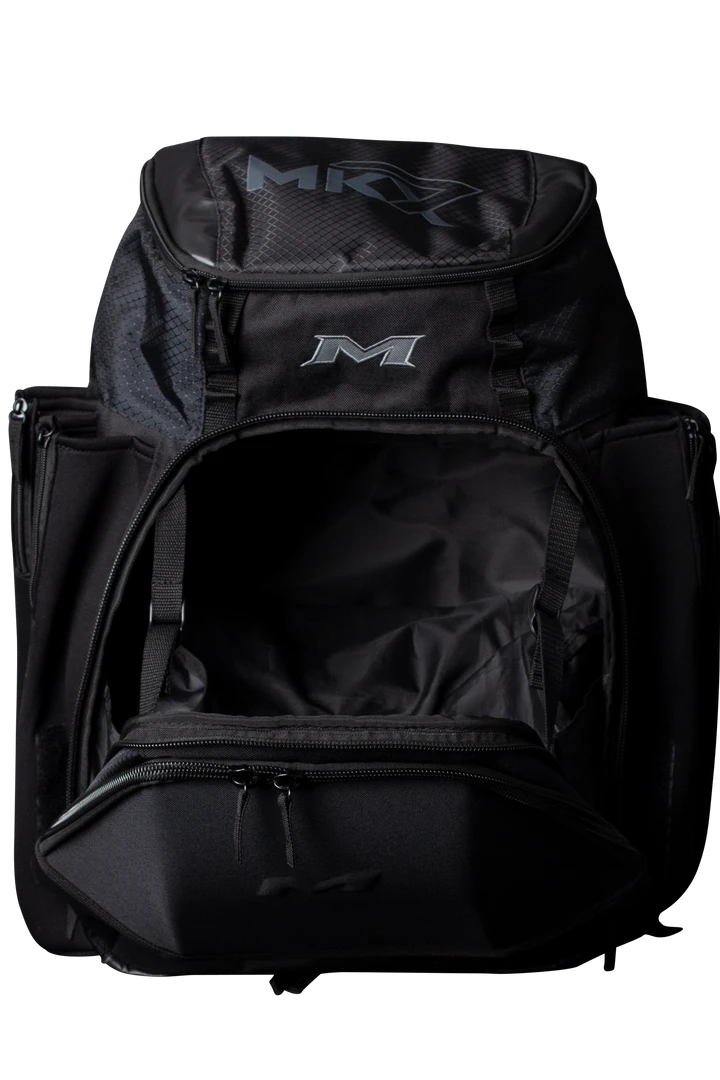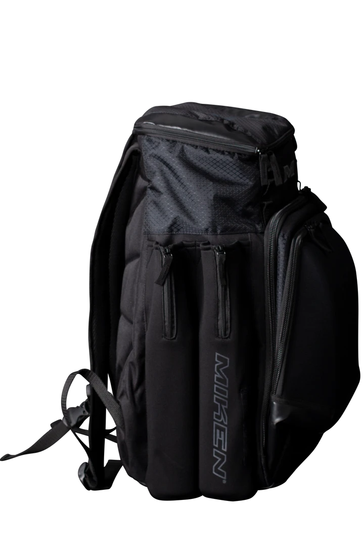The all new Miken XL Backpack features: 4 zippered neoprene bat