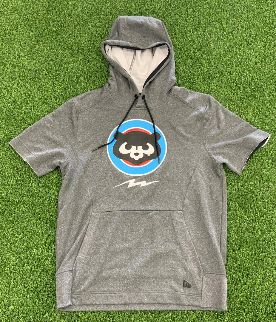 The cut-off sleeves give this hoodie a retro athletic look.